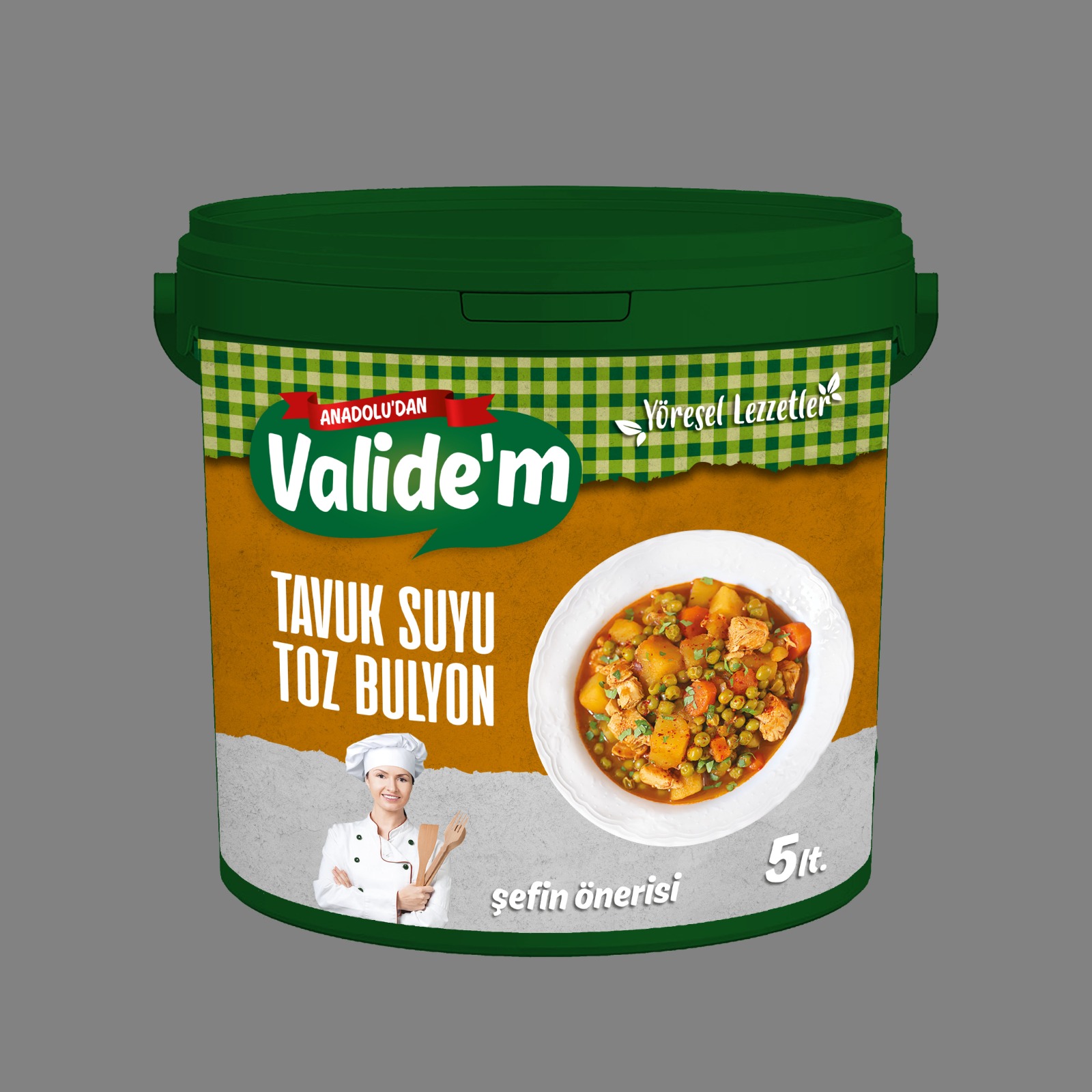 Mevsiminde toplanmış ve doğal yöntemlerle kurutulmuş 1. sınıf sebzelerin, baharatların ve gelişmiş teknolojik yöntemlerle işlenmiş tavukların işleme uygun harmanlanmasıyla elde edilmiş, katkısız ürünlerden oluşmaktadır. Valide'm Tavuk Suyu Toz Bulyon gerek endüstriyel mutfakların ve gerekse kendi mutfaklarlarınızda kullanabileceğiniz bir ürün olup, tavuk yemeklerinde, sebzeli yemeklerde, çorba, pilav ve makarnalarda güvenle kullanılabilecek ve marjinal verim alınabilecek bir üründür. Kalite ve Hijyen açısından yüksek bir teknoloji kullanılarak el değmeden üretilmektedir.